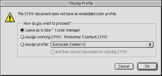 그것이 뜨는 이유는 포토샵이 6버전 이후부터 컬러세팅의 기능이 추가되면서 각 컴퓨터마다 색기준이 틀려 현재 님이 쓰고 있는 세팅에 맞추시던가 말던가 하시라는 얘기라서.. 님의 컴터에서 작업하지 않은 파일들은 모두 뜨게 되는것 같습니다~^^