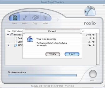 아님 verify를 하지 말고 바로 eject 하시던지요...아님 토스트 프로그램버전이 안맞던지.....